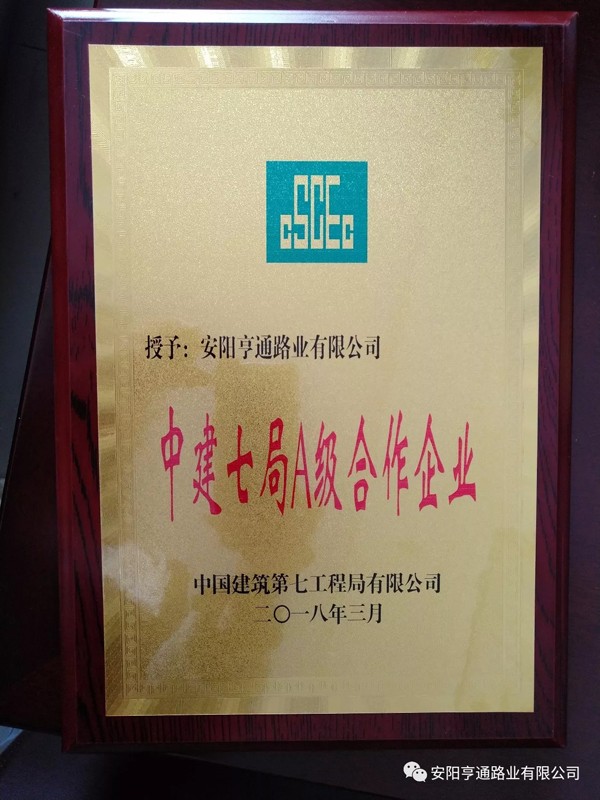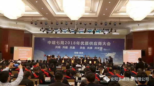 在2018年3月8日中建七局交通公司“2018年度生產(chǎn)推進會暨2017年度供應商大會”上,安陽亨通路業(yè)有限公司又獲得了中建七局交通公司頒發(fā)的“優(yōu) 秀合作企業(yè)”的榮譽稱號。